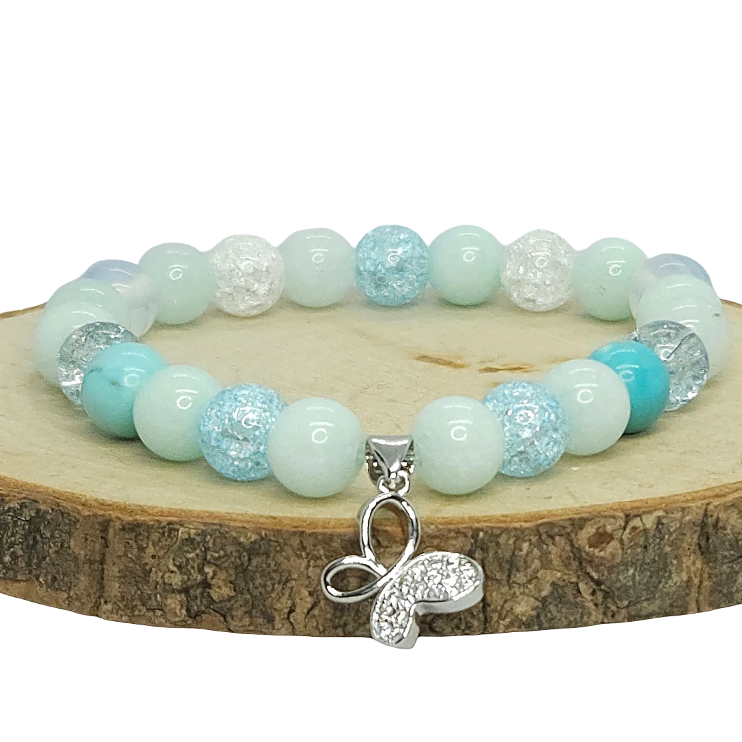 Maláj jáde - opalit - türkinit - roppantott kristály karkötő nemesacél cirkónia strasszos pillangó medállal